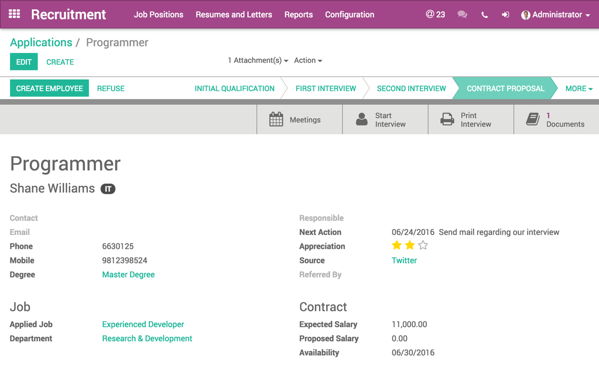 Set up a job board to post open positions in just a few clicks and easily keep track of submitted applications. Oversee and manage your applicant pipeline and integrate Odoo Survey to create a screening questionnaire which automatically associates with the candidate record.